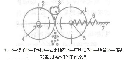 将破碎物料经给料口落入两辊子之间,进行挤压破碎,成品物料自然落下。遇有过硬或不可破碎物时,其辊子可凭液压缸或弹簧的作用自动退让,使辊子间隙增大,过硬或不可破碎物落下,从而保护机器不受损坏。相向转动的两辊子有一定的间隙,改变间隙,即可控制产品排料粒度。