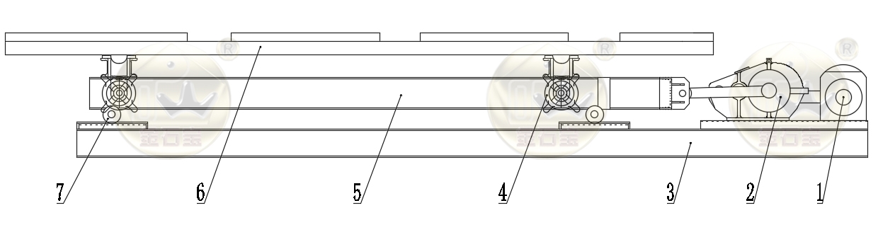 1、电机 2、减速机 3、底座 4、调坡机构 5、托架 6、床面 7、滑动机构