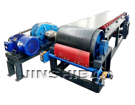 物料通过漏斗、闸门,落到输送带上。由闸板和下面密排的缓冲托辊承担。驱动装置通过传动滚筒,使输送带均速线运动,